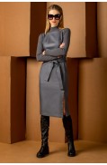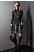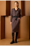 Платье женское, прямого силуэта. Рукав длинный втачной, низ рукава обработан манжетой из искусственной кожи на 2х кнопках. Горловина круглая, обработана чулком. На переде изделия симметрично расположены декоративные обтяжные пуговицы (8шт). На спинке изделия по линии талии расположен текстильный пояс на резинке из искусственной кожи. Низ заработан чулком.Длина изделия: 104 - 108,5 см. в зависимости от размера Длина рукава: 47 см. Состав: шерсть - 41%, вискоза - 10%, ПАН - 49%; отделка: ПЭ - 40%, эластан - 60%..