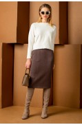 Костюм женский, состоящий из джемпера и юбки. Изделия выполнены в жаккардовом переплетении пряж 4х цветов. Джемпер прямого силуэта. Рукав втачной, одношовный, длиной ¾. Вырез горловины круглый, закеттлёван бейкой. Низ джемпера и рукава – сдвоенная кулирная гладь гармонирующего цвета с колоритом жаккарда. На переде джемпера и на рукавах, в нижних частях деталей настрочена тесьма 2х видов, по цвету гармонирующая с колоритом жаккарда. Юбка прямая, на поясе. Низ юбки – сдвоенная кулирная гладь гармонирующего цвета с колоритом жаккарда. Пояс юбки – сдвоенная кулирная гладь. Подкладка юбки гармонирующего цвета с колоритом жаккарда. Изделия отстрочены в цвет составляющих деталей.Длина джемпера: 56 - 62 см. в зависимости от размераДлина рукава: 48 см.Длина юбки: 60 см.Состав: хлопок - 17%, вискоза - 46%,ПАН - 31%, метанит - 6%; подкладка: ПЭ - 100%..
