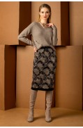 Костюм женский, состоящий из джемпера и юбки. Изделия выполнены в жаккардовом переплетении пряж 4х цветов. Джемпер прямого силуэта. Рукав втачной, одношовный, длиной ¾. Вырез горловины круглый, закеттлёван бейкой. Низ джемпера и рукава – сдвоенная кулирная гладь гармонирующего цвета с колоритом жаккарда. На переде джемпера и на рукавах, в нижних частях деталей настрочена тесьма 2х видов, по цвету гармонирующая с колоритом жаккарда. Юбка прямая, на поясе. Низ юбки – сдвоенная кулирная гладь гармонирующего цвета с колоритом жаккарда. Пояс юбки – сдвоенная кулирная гладь. Подкладка юбки гармонирующего цвета с колоритом жаккарда. Изделия отстрочены в цвет составляющих деталей.Длина джемпера: 56 - 62 см. в зависимости от размераДлина рукава: 48 см.Длина юбки: 60 см.Состав: хлопок - 17%, вискоза - 46%,ПАН - 31%, метанит - 6%..