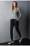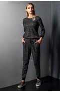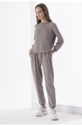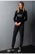 Брюки женские, зауженные к низу, выполнены в жаккардовом переплетении 4х цветов.Брюки на поясе – сдвоенная кулирная гладь. Также на поясе обработана кулиска с завязками.На передних половинках брюк заложены складки и обработаны карманы с отделкой – руликом.Брюки на манжетах - сдвоенная кулирная гладь.Отстрочка деталей брюк – в цвет.Длина брюк: 99 - 102 см. в зависимости от размераСостав: хлопок - 10%, вискоза - 68%, ПАН - 19%, метанит - 3%..