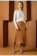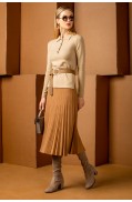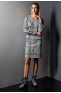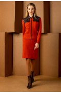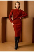 Костюм женский, состоит из джемпера и юбки. Джемпер женский свободного силуэта. Рукав спущенный, втачной. Горловина круглая обработана ластиком. Низ рукава заработан ластиком. Юбка женская прилегающего силуэта, на подкладке. Длина ниже каолена. Притачная эластичная лента с подворотом.Длина джемпера: 54 - 57 см. в зависимости от размераДлина рукава: 44 см.Длина юбки: 72см.Состав: вискоза - 51%, ПАН - 34%, ПА - 13%, метанит - 2%; подкладка: ПЭ - 100%..