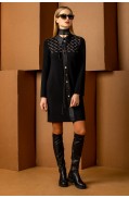 Платье женское. Прямого силуэта. Рукав длинный втачной. Воротник стояче-отложной из искусственной кожи. На переде расположена планка настрочная из искусственной кожи, застегивающаяся на 4 кнопки функциональные и 7 декоративных. По переду до линии груди исполнен авторский жаккард, который дополнен декором. Низ рукава и изделия заработан чулком.Длина платья: 94 - 99 см. в зависимости от размераДлина рукава: 15,5 - 18,5 см. в зависимости от размера Состав: вискоза - 55%, ПАН - 30%, ПА - 13%, метанит - 2%..