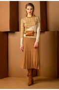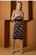 Юбка женская прямого, полуприлегающего силуэта, ниже колена. Авторский рисунок (жаккард). На переде пояса расположены шлевки разных размеров, в которые продеты кольца (2шт) . Низ изделия заработан. Юбка на подкладке, пояс на эластичное тесьме.Длина юбки: 65 см.Состав: хлопок - 18%, вискоза - 47%, ПАН - 30%, метанит - 5%; подкладка: ПЭ - 100%..
