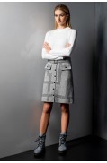 Юбка женская на подкладке. Верх обработан поясом. По переду имит. застежки и карманов с клапанами , украшен. кнопками пробивн. Низ юбки заработан.Длина юбки: 51 см.Состав: шерсть мериноса - 11%, вискоза - 47%, ПЭ - 20%, ПА - 22%; подкладка: ПЭ - 100%..