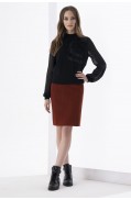 Юбка женская, прямого силуэта, на подкладке. По переду изделия вывязаны карманы и декорат. переплетение. На поясе расположены шлевки. (2 спереди, 1 сзади) с декоративной кнопкой. Низ заработан чулком.Длина изделия: 68 см.Состав: вискоза - 46%, ПА - 14%, ПАН - 40%..