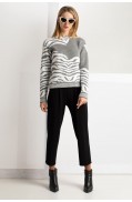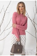 Джемпер женский полуприлегающего силуэта с 3/4, втачными рукавами. V-образный вырез горловины закеттлевана "сложной" бейкой. Низ стана и рукавов заработаны.Длина изделия: 53,5 - 57 см. в зависимости от размераДлина рукавов: 46 см.Состав: вискоза - 90%, метанит - 5%, ПА - 5%..