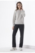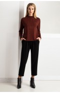 Комплект женский, состоящий из джемпера и брюк. Комплект выполнен в жаккардовом переплетении пряж гармонирующих цветов. Джемпер прямого силуэта. Рукав втачной, одношовный, длинный, по покрою – спущенное плечо. Низ рукава – ластик. Воротник – стойка, выполнена в переплетении ластик. Также в горловину вкеттлёвана бейка со штрипкой-имитацией завязки. В переде и спинке по низу - заработок ластик. Брюки длинные, прямого силуэта, зауженные к низу. Низ брюк и пояс – сдвоенная кулирная гладь. На переде обработаны карманы с руликами по краям. Перед джемпера выполнен в жаккарде четырёх цветов с рисунком «Деграде». Спинка, рукава джемпера, а также детали брюк выполнены в трёхцветном жаккарде.Длина джемпера: 59 - 62 см. в зависимости от размераДлина рукава: 50 см.Длина брюк: 96 - 99 см. в зависимости от размераСостав: хлопок - 17%, вискоза - 39%, ПАН - 41%, метанит - 3%..