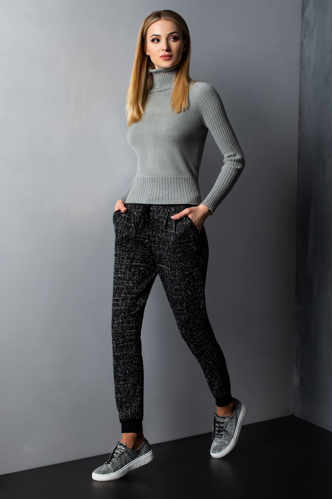 Брюки на поясе – сдвоенная кулирная гладь. Также на