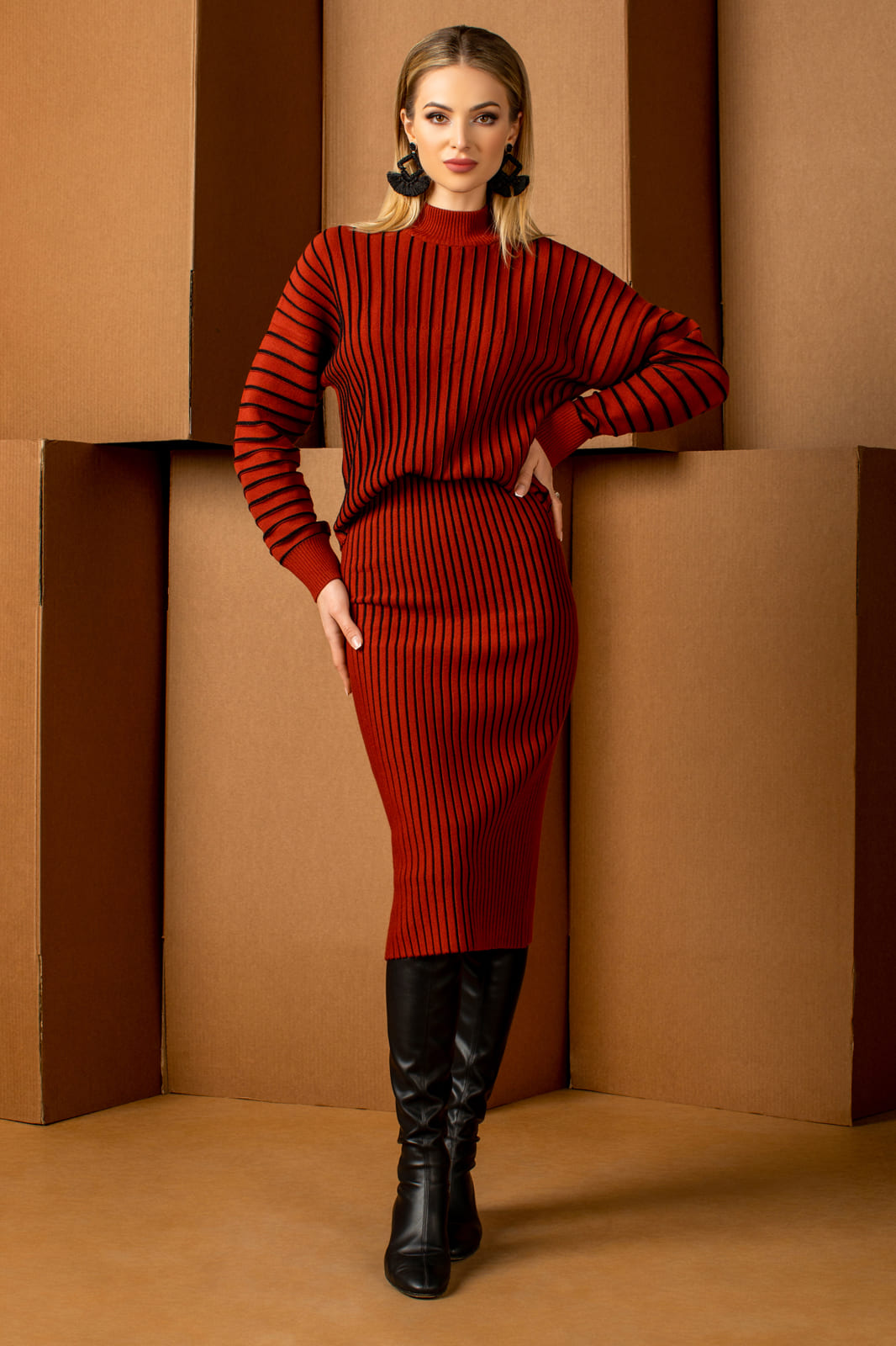 Костюм женский, состоит из джемпера и юбки. Джемпер женский свободного силуэта. Рукав спущенный, втачной. Горловина круглая обработана ластиком. Низ рукава заработан ластиком. Юбка женская прилегающего силуэта, на подкладке. Длина ниже каолена. Притачная эластичная лента с подворотом.