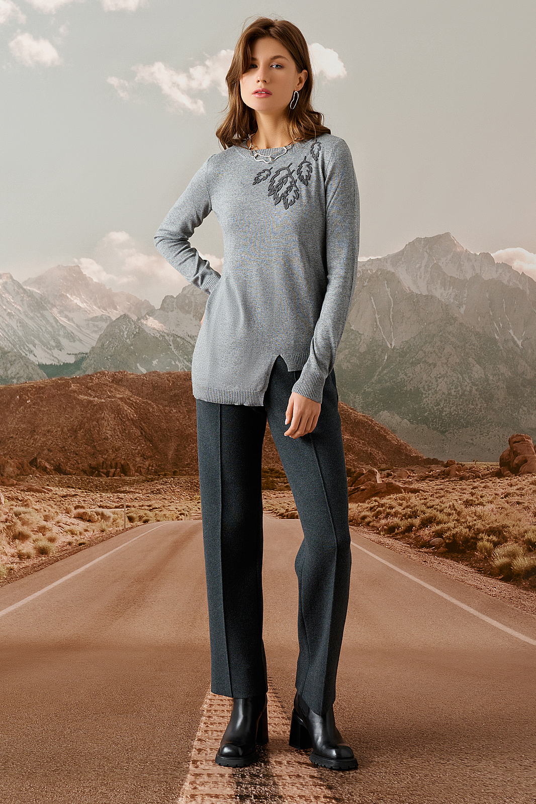 Джемпер женский прямого силуэта из меланжевой пряжи. Рукав втачной, одношовный, длинный. Вырез горловины круглый, закеттлеван бейкой - ластиком. Низ изделия - асимметричный, состоящий из длинной и короткрй частей. По низу частей джемпера и рукава - ластики. На переде джемпера - декор, состоящий из настроченных листьев из фетра в гармонирующей гамме с цветом пряжи.