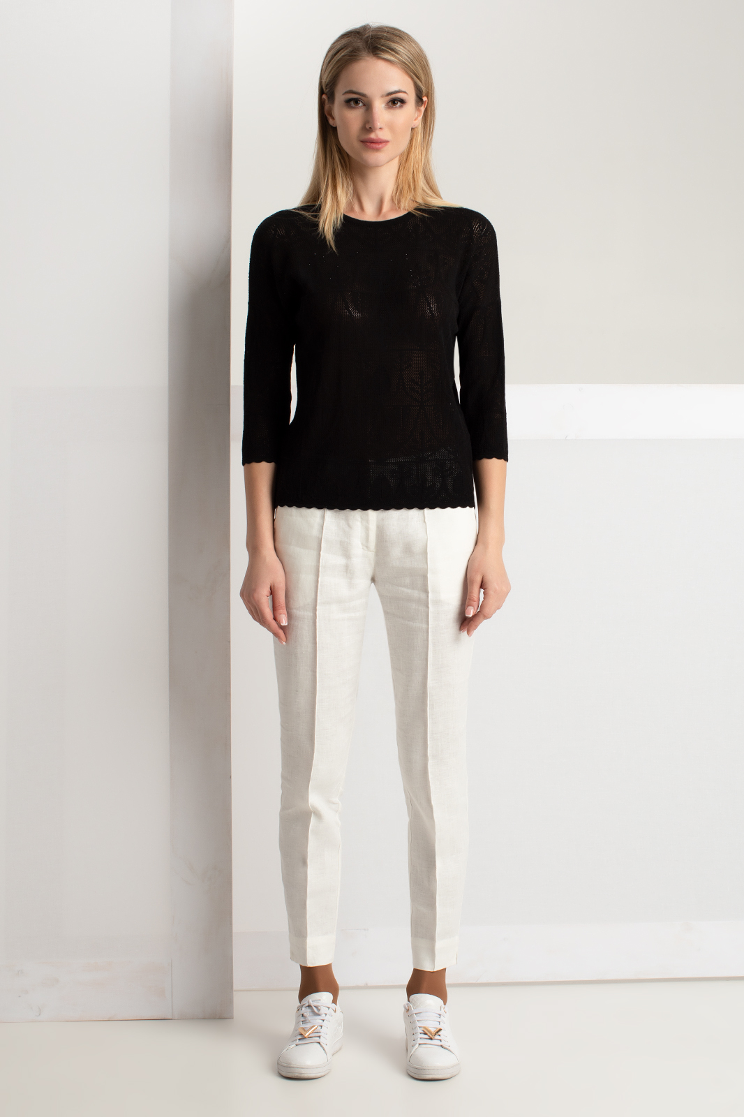 Джемпер женский полуприлегающего силуэта со спущен. плечев. поясом, рукава 3/4. Круглый вырез горловины закеттлеван бейкой чулком. Низ стана и рукавов заработаны. По переду джемпер украшен клеевыми стразами.