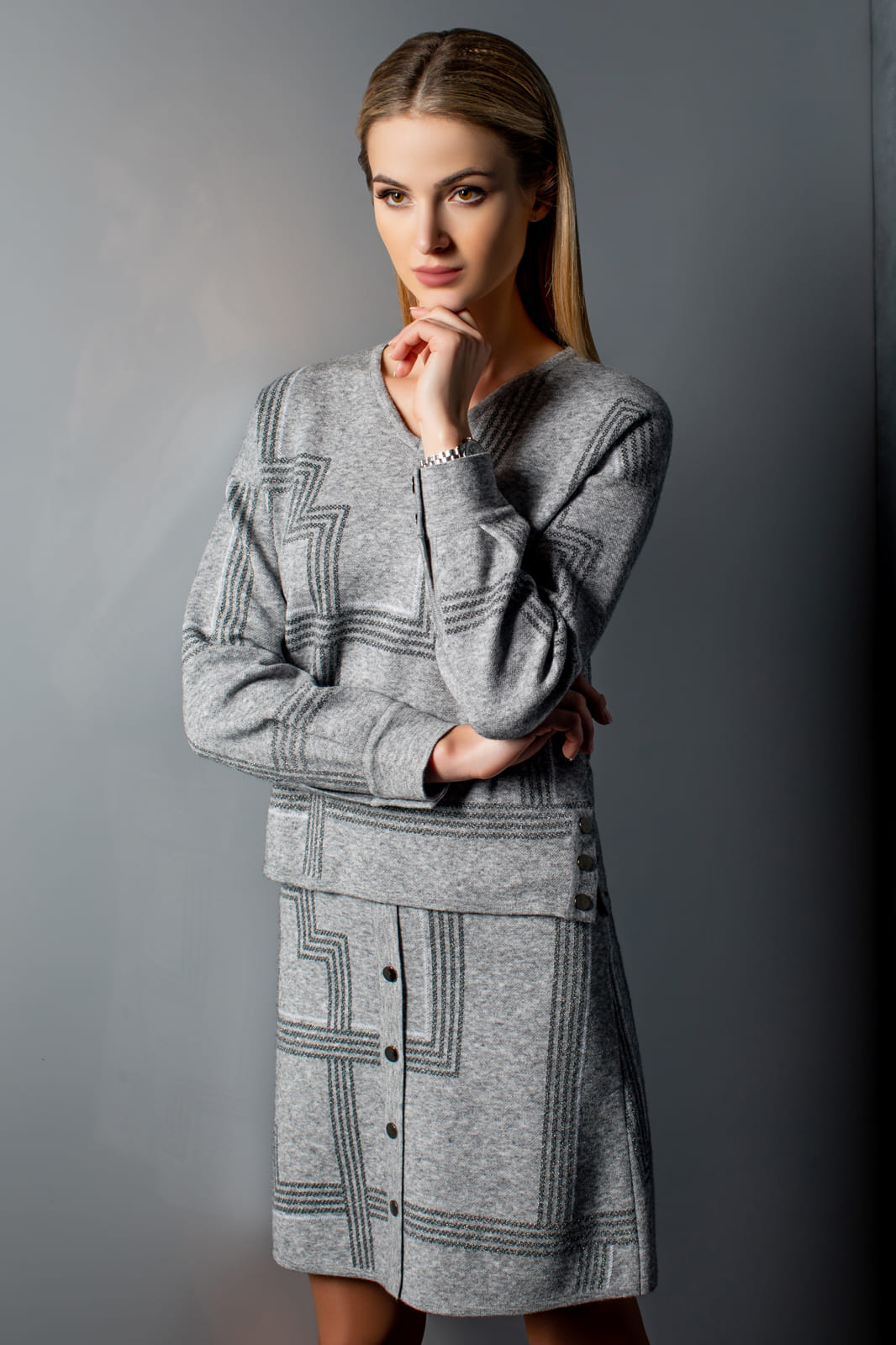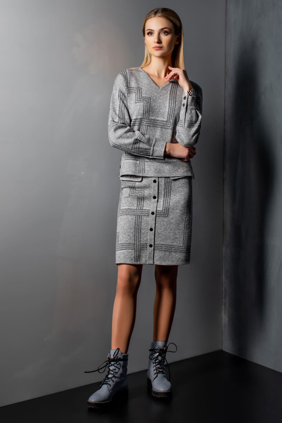 Джемпер женский полуприлегающего силуэта с длинными "спущ" рукавами. Низ рукавов обраб. манжетами с застежкой на пробивные кнопки. V- обр вырез горловины закеттлеван бейкой. В боковых швах закеттлев. "разрезы" с застежкой на пробивные кнопки. Низ изделия заработан.