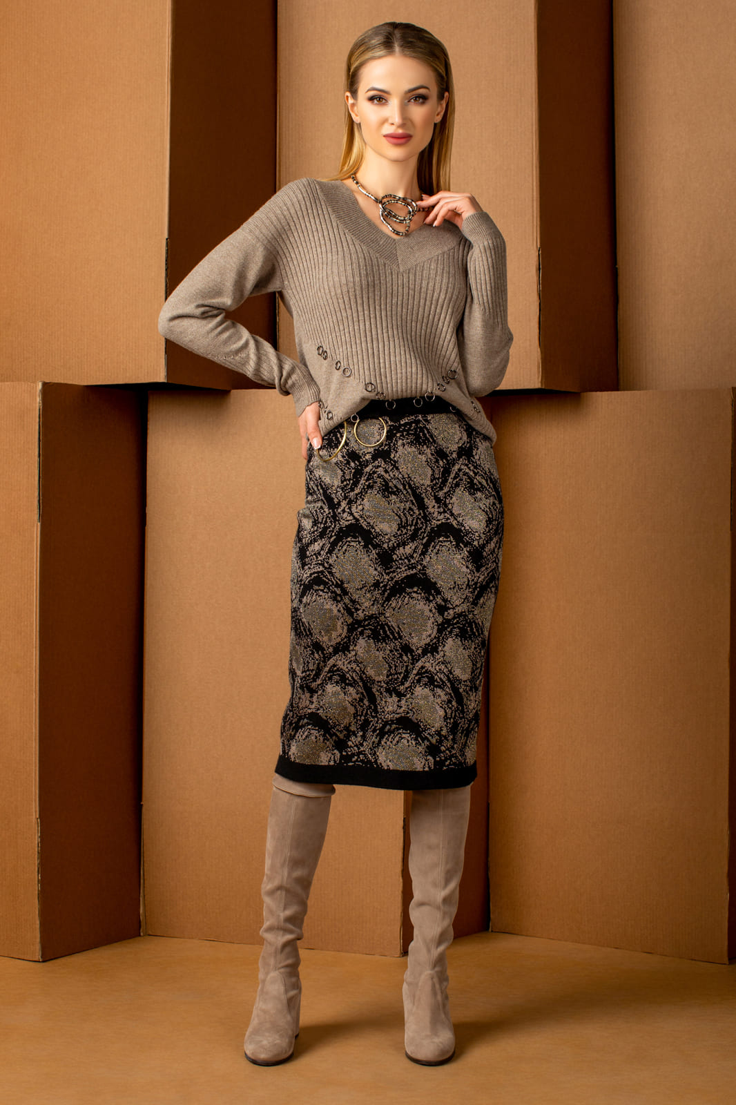 Джемпер женский прямого, свободного силуэта. Рукав спущенный, втачной, длинный. Горловина V-образная по переду закеттлевана бейкой. По переду декор-кольца. Низ изделия и рукавов обработаны ластиком.