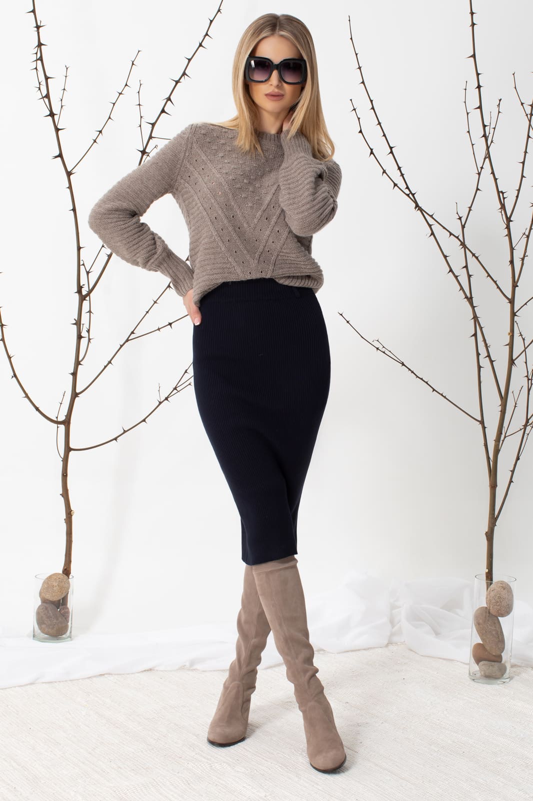 Джемпер женский полуприлегающего силуэта с длин. втачными рукавами. Низ кот "собран" на ластичн. манжету. По переду вывязан рисунок. Круглый вырез горловины закеттлеван. Низ стана заработан.