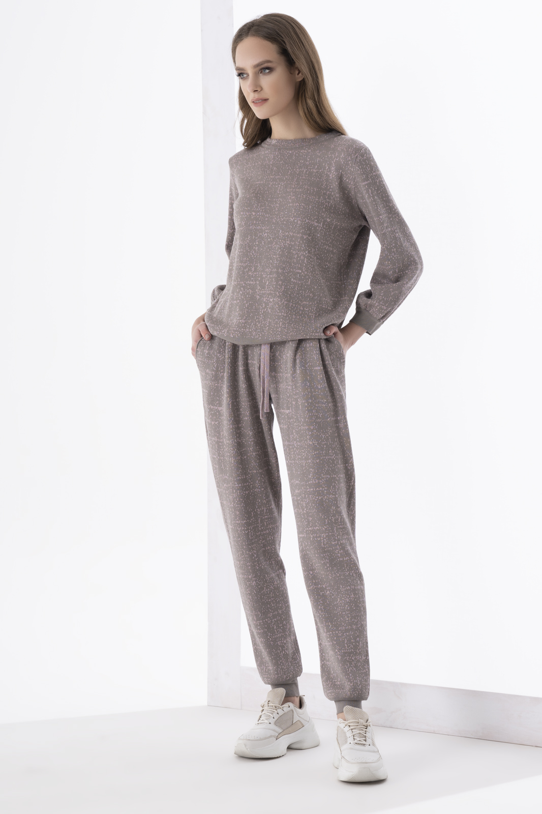 Джемпер женский прямого силуэта, выполнен в жаккардовом переплетении пряж 4х цветов.Рукав втачной, одношовный, длинный. По низу- манжета, однотонная, сдвоенная кулирная гладь. Вырез горловины круглый, закеттлеван жаккардовой бейкой. Низ джемпера - сдвоенная кулирная гладь.