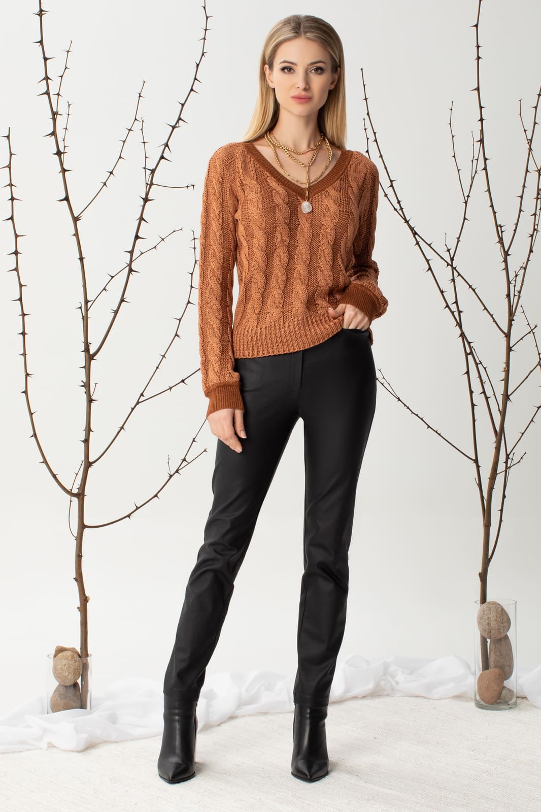 Джемпер женский с длин. рукавами, низ кот. закеттлеван "манжетами". V- образный вырез горловины закеттлеван бейкой. Низ стана заработан.