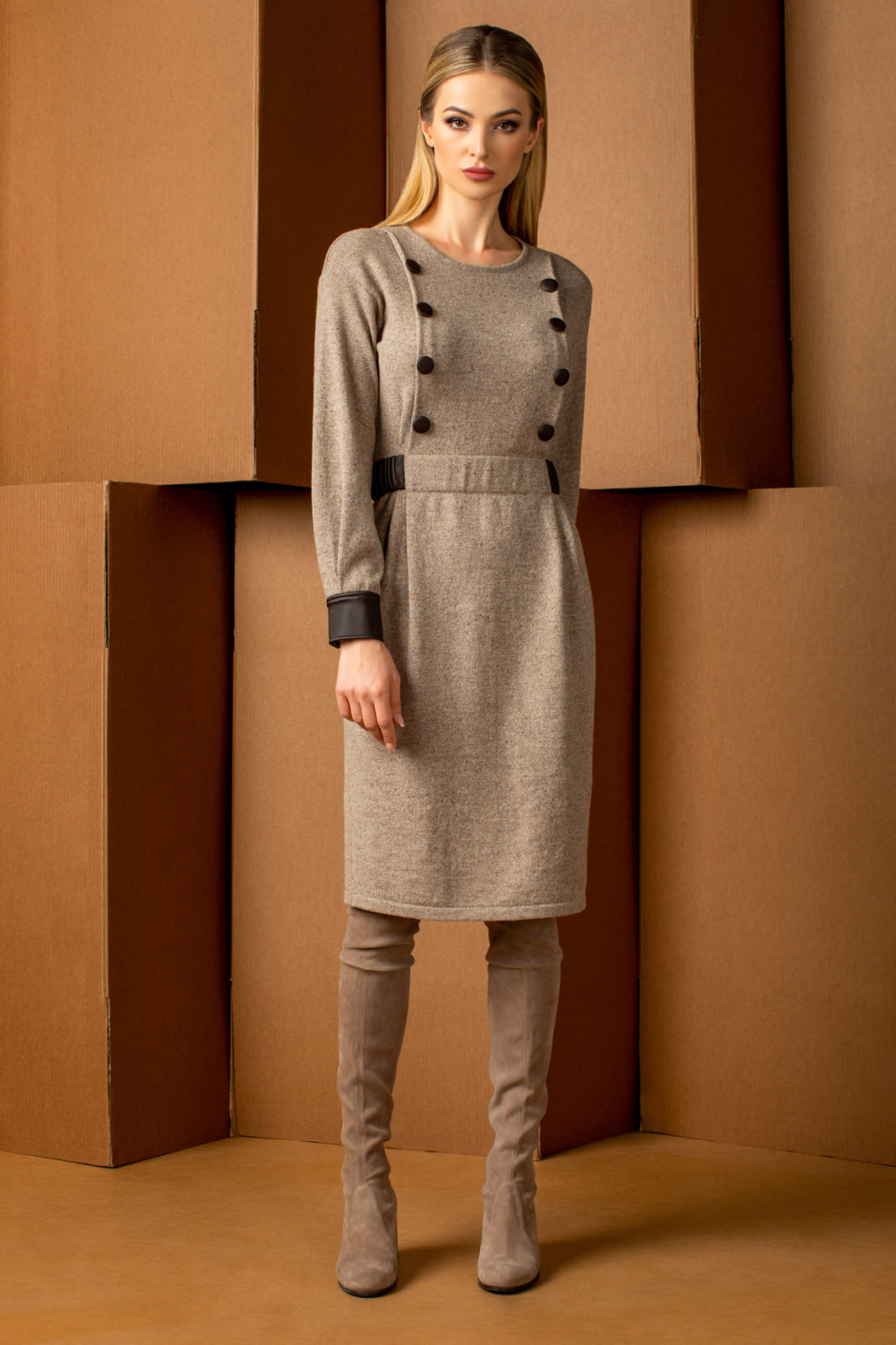 Платье женское, прямого силуэта. Рукав длинный втачной, низ рукава обработан манжетой из искусственной кожи на 2х кнопках. Горловина круглая, обработана чулком. На переде изделия симметрично расположены декоративные обтяжные пуговицы (8шт). На спинке изделия по линии талии расположен текстильный пояс на резинке из искусственной кожи. Низ заработан чулком.