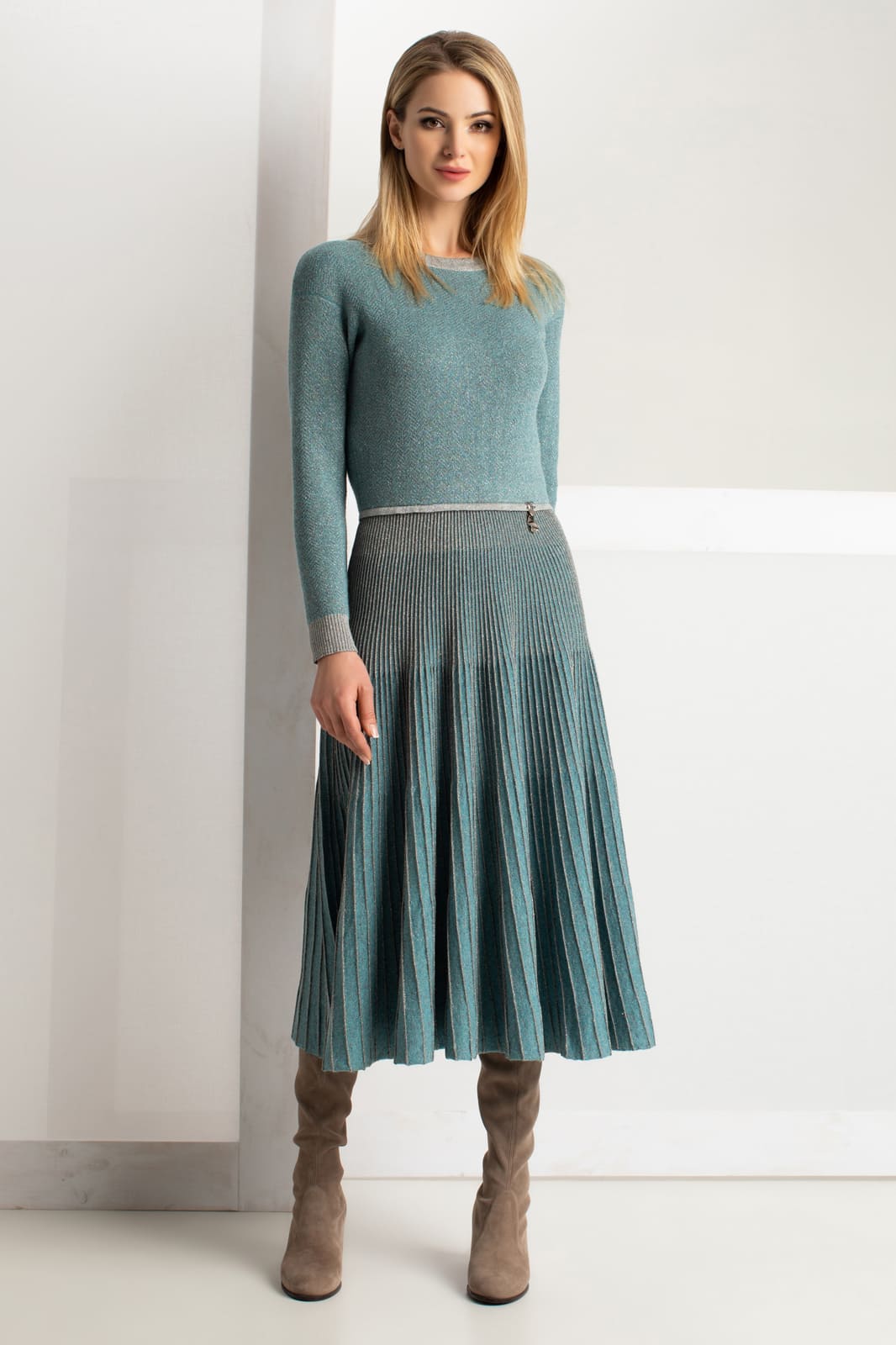 Платье женское X-образного силуэта, двухцветное. Рукав втачной, одношовный, длинный, по крою - спущенное плечо. Манжеты - ластик из однотонной пряжи с люрексом. Вырез горловины круглый, закеттлеван бейкой из пряжи с люрексом. Верх платья и рукава выполнены в жаккардовом переплетении, низ - в комбинированном переплетении 2х пряж. Подкладка в платье - в гармонирующем цвете с колоритом изделия. Платье дополнено логотипом под металл.