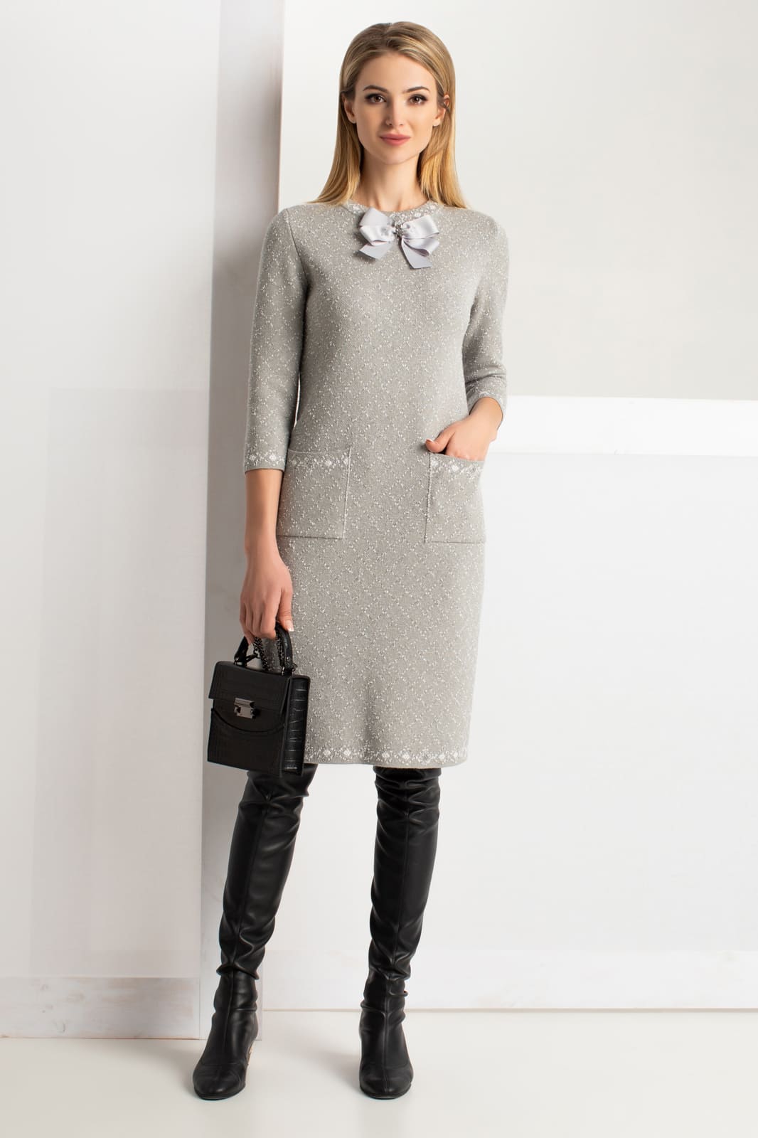 Платье женское полуприлегающего силуэта. Круглый вырез горловины закеттлеван бейкой. Низ стана и рукавов заработаны. По переду накладные карманы, вход в карманы зараотаны.