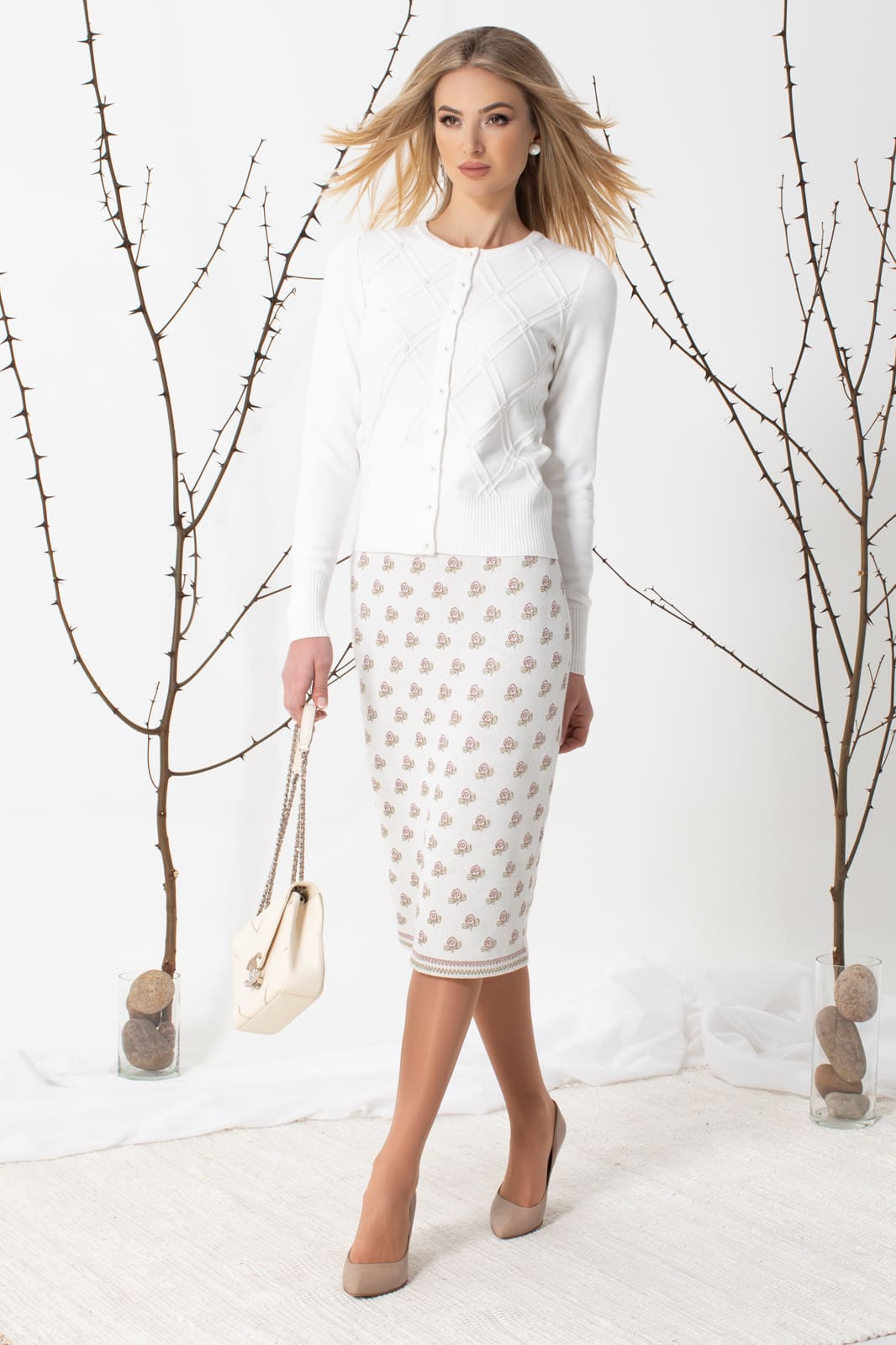 Жакет женский полуприлегающего силуэта с длинными втачными рукавами. Круглый вырез горловины закеттлеван бейкой чулком. Борта закеттлеваны бейками, застеж. на вывяз. петли, пуговицы. По переду вывяз. рис. украшен пришивными бусинами. Низ стана и рукавов заработаны.