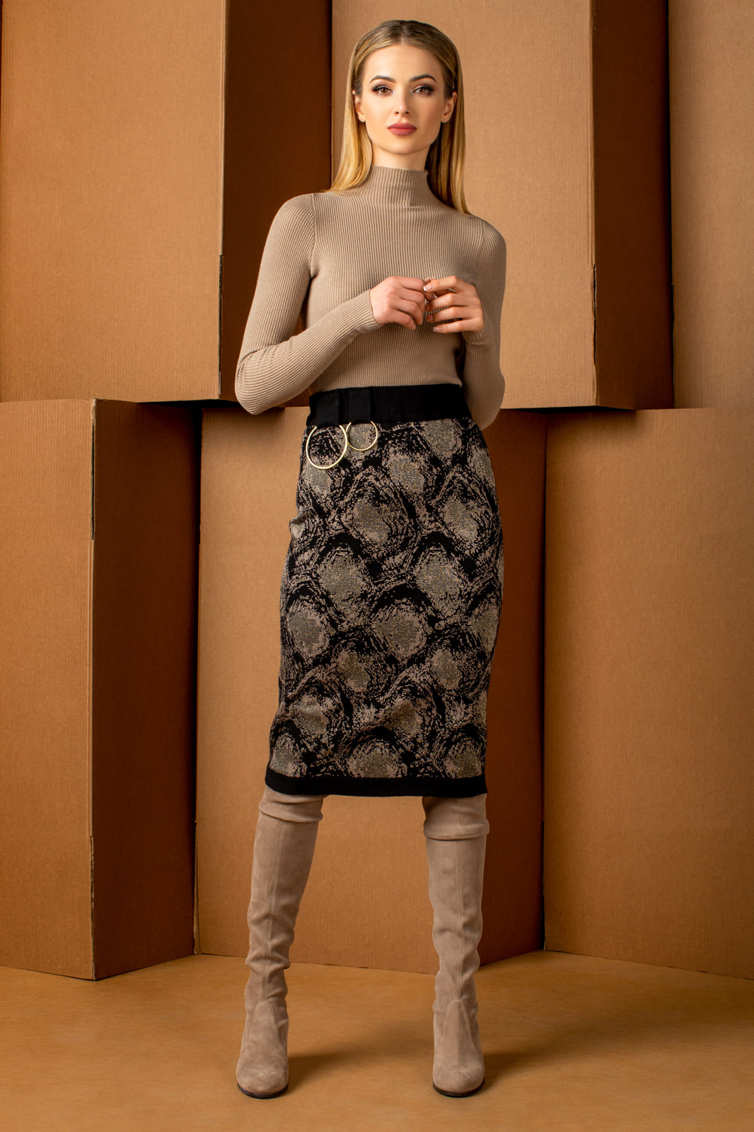 Юбка женская прямого, полуприлегающего силуэта, ниже колена. Авторский рисунок (жаккард). На переде пояса расположены шлевки разных размеров, в которые продеты кольца (2шт) . Низ изделия заработан. Юбка на подкладке, пояс на эластичное тесьме.